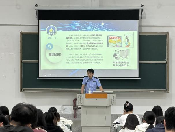 活动中,赵泽铭警官结合学生群体高发的网络购物诈骗、刷单返利等典型诈骗案例,生动拆解了各类骗局的手法与特征,让同学们直观认清诈骗行为带来的财产损失与心理创伤双重危害。此外,赵泽铭警官还现场传授了如核实信息来源、拒绝“高收益”诱惑等诈骗识别技巧,并详细讲解了遭遇诈骗后的应对流程,指导大家在遭遇诈骗后要及时报警、留存证据以降低损失。