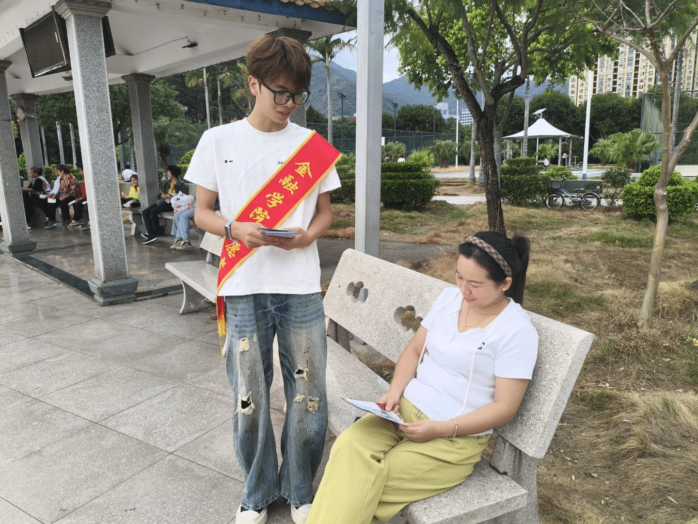 2025年11月9日下午,yl23455永利集团青年志愿者协会在福州市马尾区象山公园开展“政策暖人心,金融伴你行”志愿服务活动。20名志愿者通过政策宣传、现场咨询、有奖问答等形式,向社区居民普及国家资助政策与医保知识,助力政策红利惠及更多群众。活动历时两小时,累计发放宣传手册百余份,服务群众超200人次,展现了金融学子乐于奉献、服务社会的责任担当。